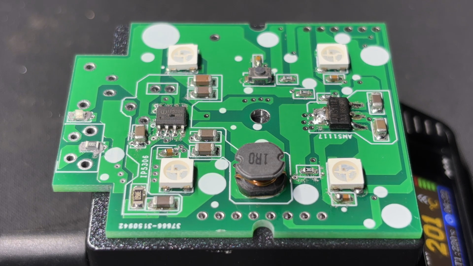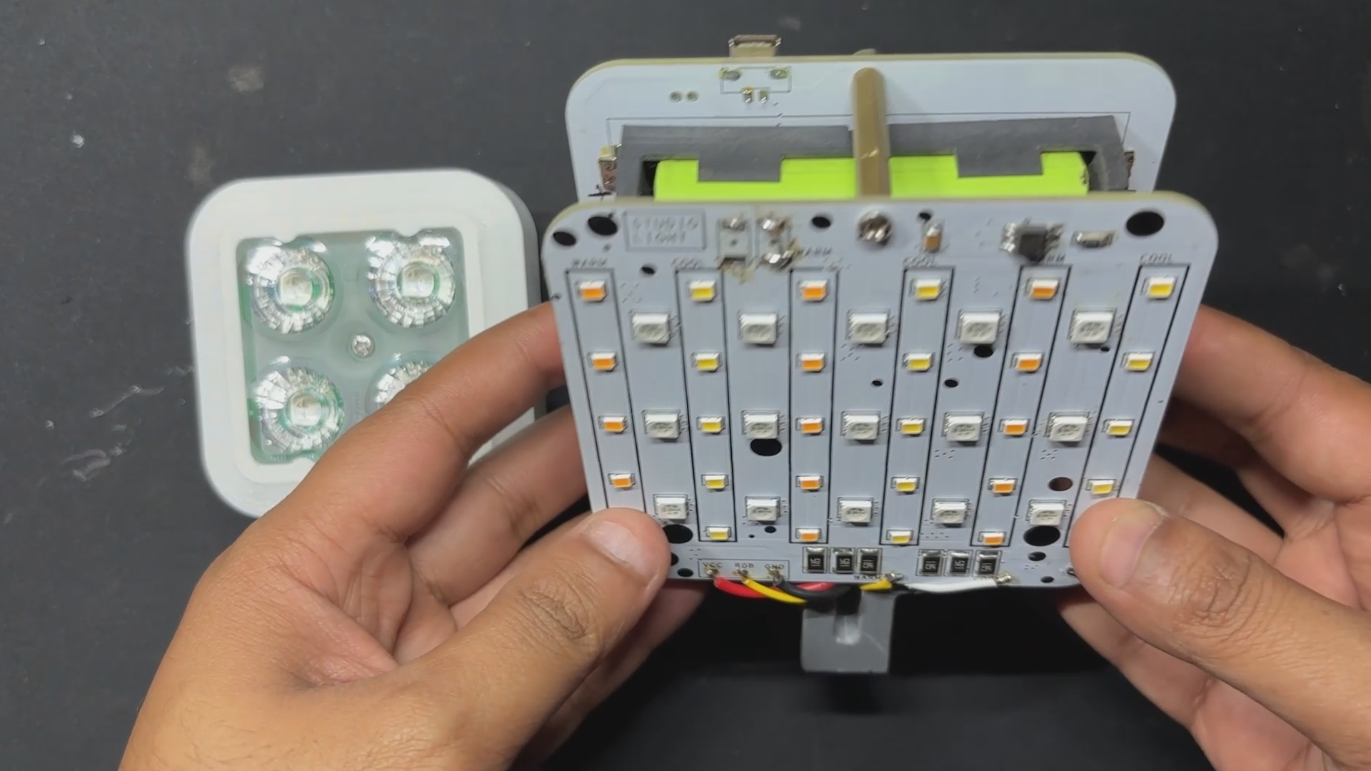 Previously, I created a similar Studio light that was far bigger and more powerful in terms of both light and battery capacity. In the initial version, I used two PCBs connected by a 3D printed bracket and a long PCB standoff. The two PCBs consisted of an LED board and a control board. The LED board contains all of the non-addressable SMD RGB 5050 LEDs, including Warm White and Cool White LEDs.
