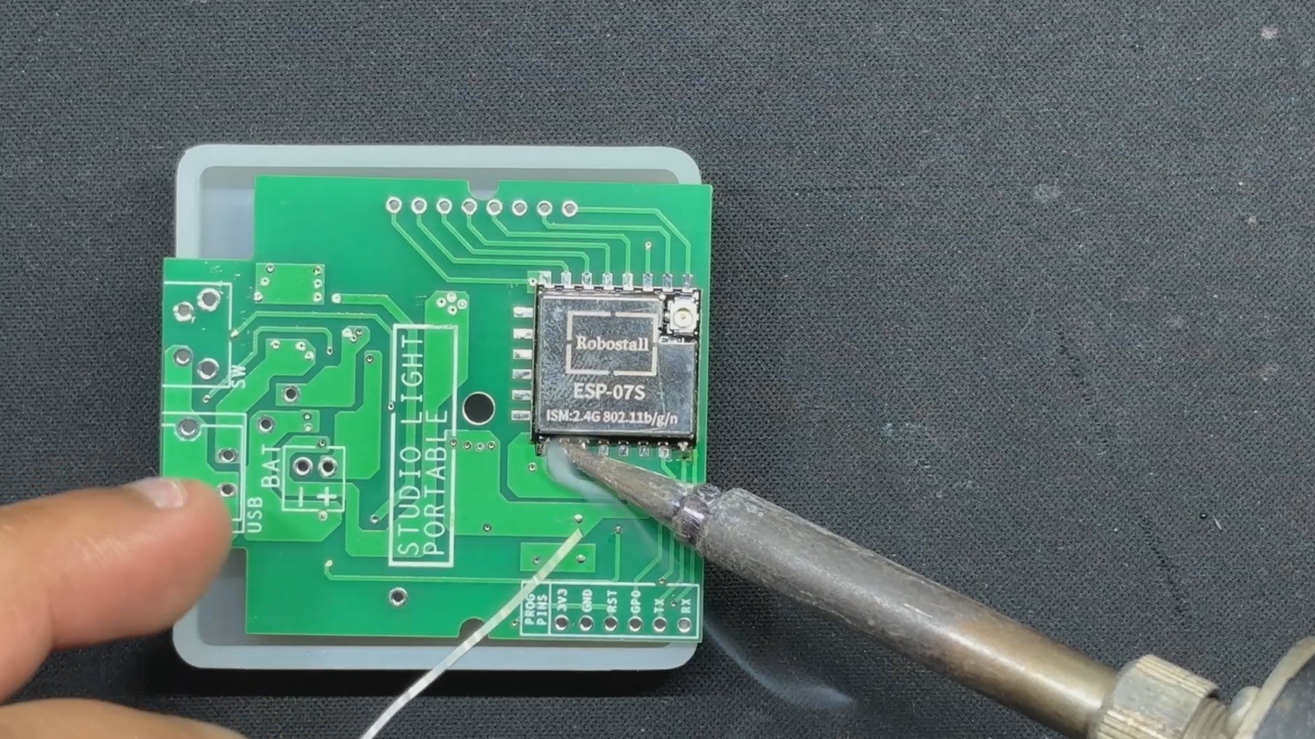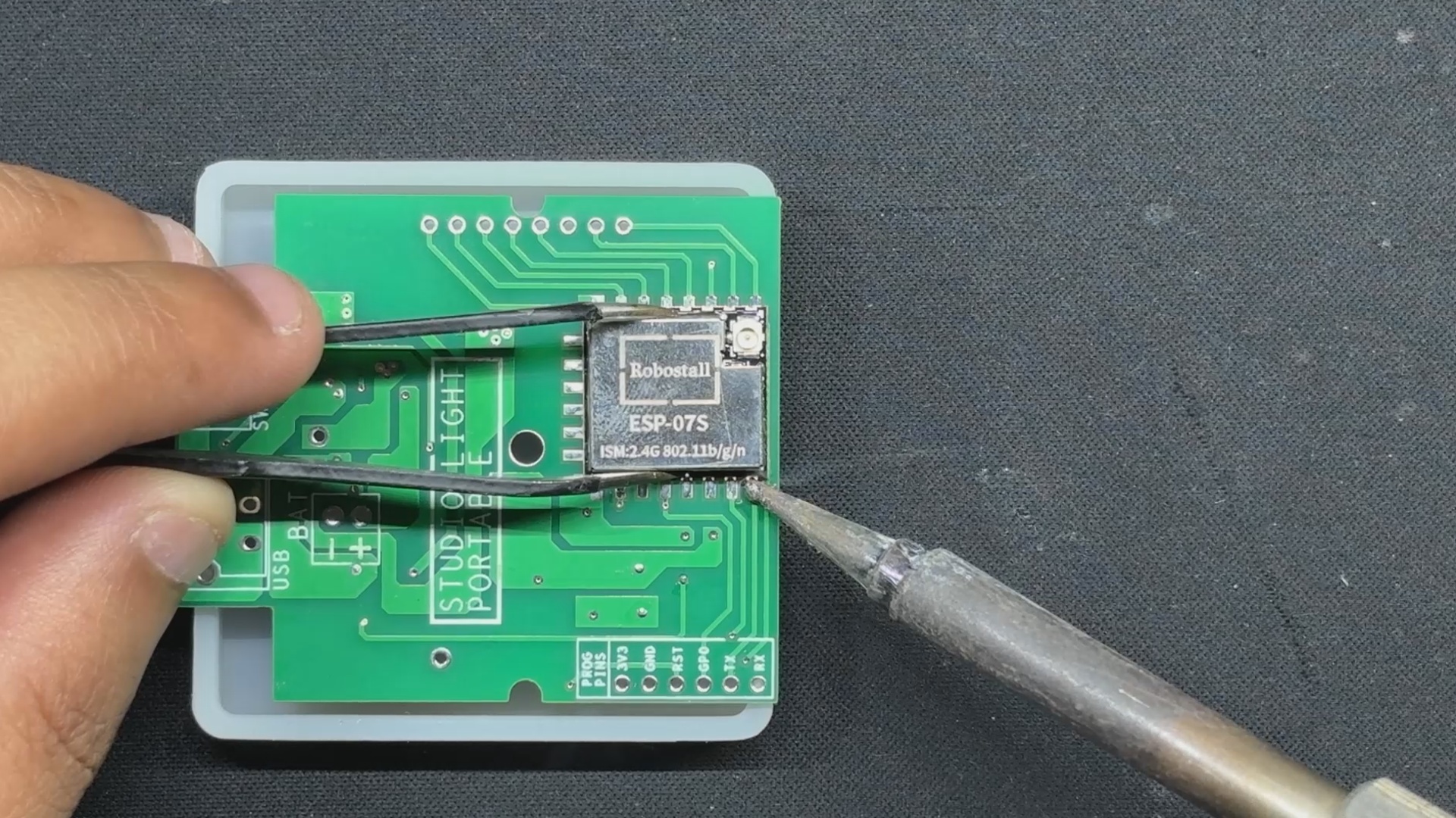 Because we are soldering on the other side of the board, we must use a soldering iron. We begin by soldering the first pad of the ESP model, which secures it in place and allows us to begin soldering the pins.