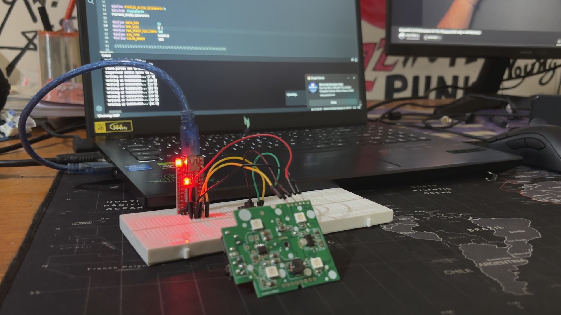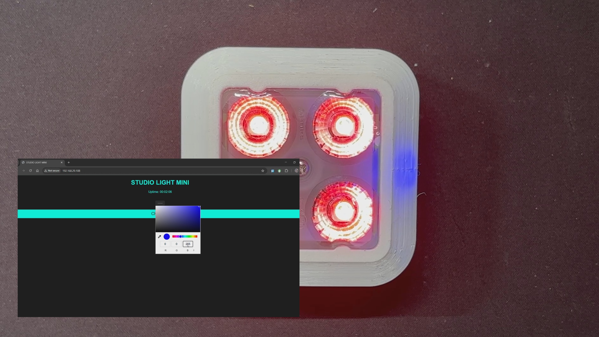 Our Setup is powered by an ESP8266, with a custom 3D-printed lens and enclosure to make the most of only four WS2812B LEDs. The web app is where the magic happens: it's simple, responsive, and works on any device. I've used my phone, laptop, and ROG Ally to control it. Simply select a hue and it refreshes instantaneously, allowing us complete creative freedom no matter where I am working.