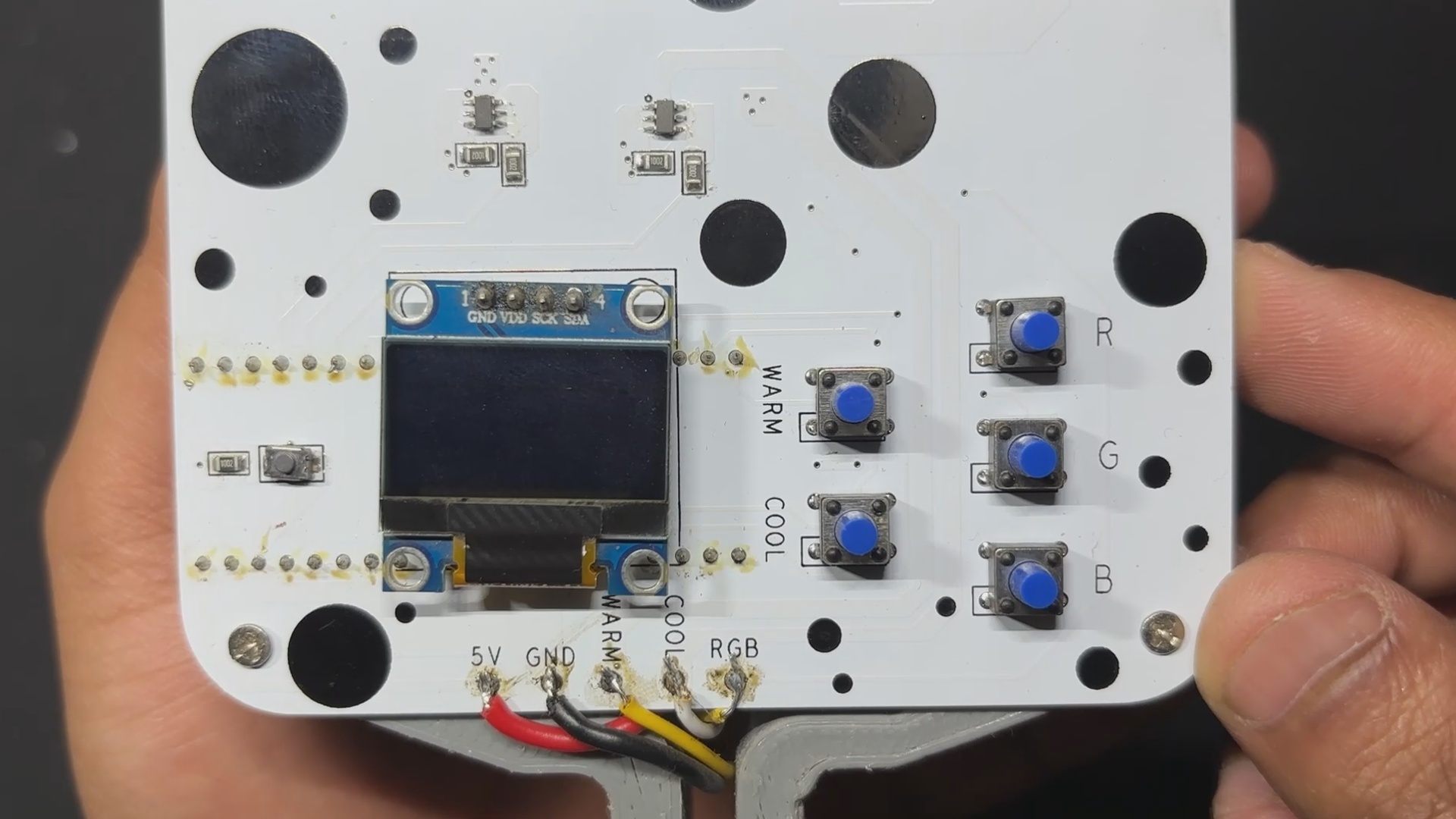 The Control board included a PICO 2 with a display, a few buttons, an integrated power source, and two 8205S Mosfets as a switch setup that we linked to the LED board to turn on and off the Warm and Cool white LEDs.