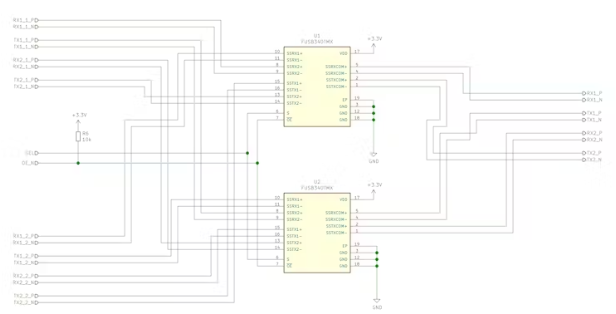 To switch the 4 differential pairs, I used two FUSB340 IC-s from ON Semiconductor. Each of these is capable to switch 2 differential pairs working at up to 10 Gbps.