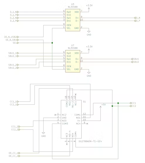 Finding suitable switching IC for the CC signals was a little bit trickier. The CC lines are used for Type-C connector orientation detection, but also for powering IC's of active cables. For this reason the switch needs to work at voltages up to 5V, and it also needs to be capable to handle a moderate amount of current.
