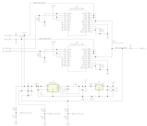 To handle this I used two UCS3205 bidirectional load switches from Microchip, one chip at each input port. The UCS3205 is a bidirectional load switch designed for USB PD applications, and is capable to handle voltages from 5 to 22, maximum current of 5A, and has an on state resistance 30 mΩ.
