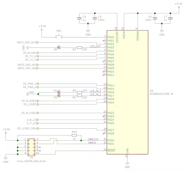 The chip has a good number of digital an analog inputs. These are used to control the switch IC-s, to handle a push button input, drive 3 LED-s and to handle the analog VBus sense lines.