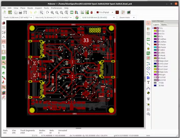 The USB Type-C Switch was designed in KiCad, with the schematics being done in Eeschema