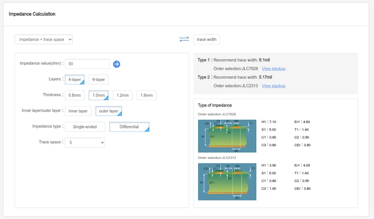 JLCPBC offers two stack-ups for controlled impedance PCB-s: JLC7628 and JLC2313. After we selected which one we like, there is a calculator that can be used to determine the correct trace width and spacing.