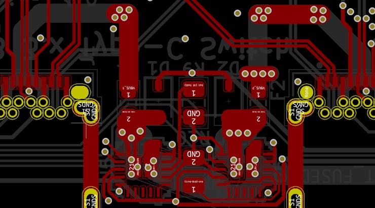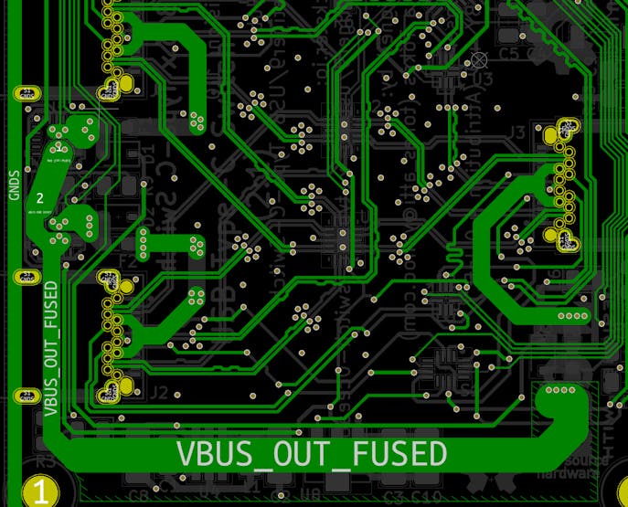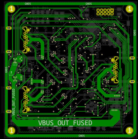 The hardest part was to extract the VBus rails from the area of the USB Type-C receptacles. The VBus rails will carry a maximum of 5A, so they need to be relatively wide, while the space around the USB Type-C receptacles is very limited.