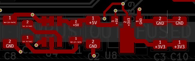 As the maximum continuous current on the 5V and 3.3V lines should be < 10 mA, the trace width are I used are relatively small: 0.3 - 0.5 mm