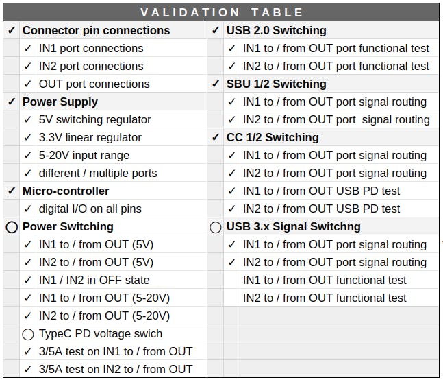 Although the USB Type-C Switch is a simple device, it still quite a bit of functionality that needs to be working: