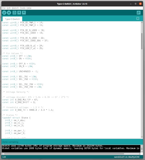 The firmware of the device was built in Arduino IDE, using a custom board definition. The ATSAMD21E15 MCU on the board is very similar to the ATSAMD21G18 used in the Arduino Zero, so creating a custom board definition was easy: