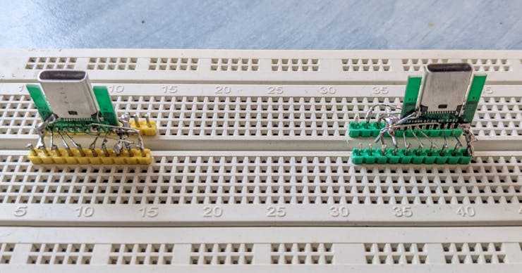 Then I continued with soldering all the USB Type-C connectors, and checking all the connections using a multimeter, and USB Type-C cable and breakout boards: