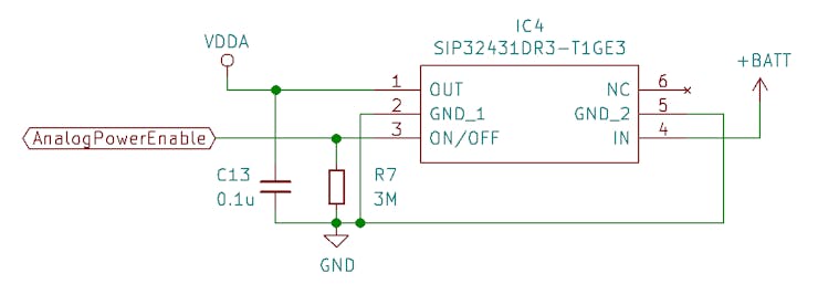 The digital part of the circuit is connected directly to the battery, while the analog sub-circuit is powered through the Vishay SiP32431 load switch.