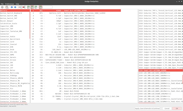 The last step in Eeschema was to assign footprint to components. This is done in the Assign Footprints editor.