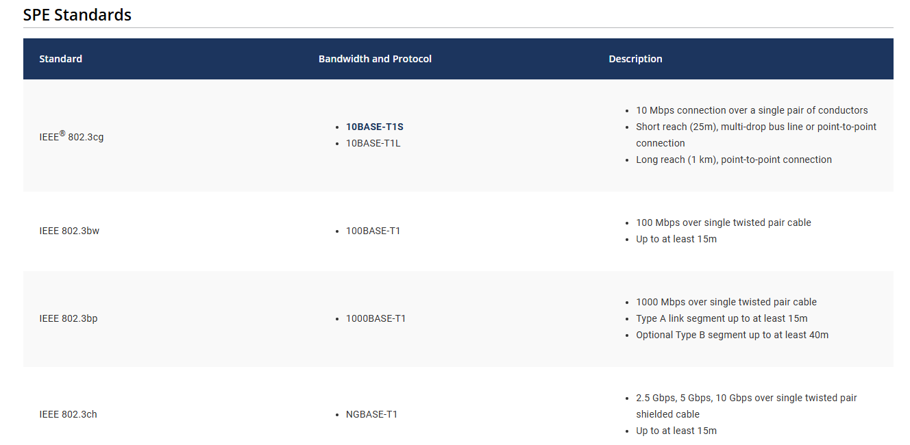 Single Pair Ethernet is another wired technology that reduces complexity and works on single pair of twisted pair cables for data transfer. This will reduce the overall data rate than the Ethernet itself but it's useful in applications that do not require very high data rates. The underlying standard for SPE is IEEE802.3cg. The following screenshot from Microchip explains this in detail. It also has distance and data rate mentioned for each substandard.