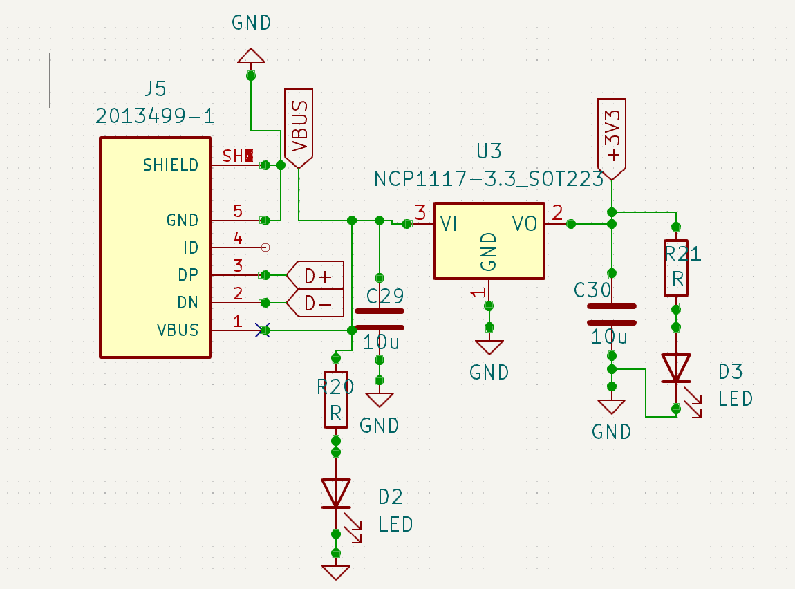 For the power supply to the device, I am using LDO (Low Droupout Regulator). The NCP1117-3.3 is a LDO that can convert 5 V input to 3.3 V output required for RP-2050. I am using micro-USB connector from Texas Instruments. There is also a possibility to use some DC-DC converter to have more power efficient design that can reduce overall power consumption but at the cost of complexity. Hence, I decided to use LDO for the time.