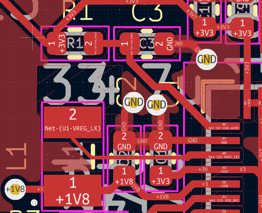 The Hardware Design guidelines suggest using proper layout of the components and its values. Specifically, the placement of components L1, C1, C2 and C3 should be done properly. Above all the L1 inductor has a polarity marking and should be placed as per the marking. The +1V8 marks positive and the other side is negative and should be followed.
