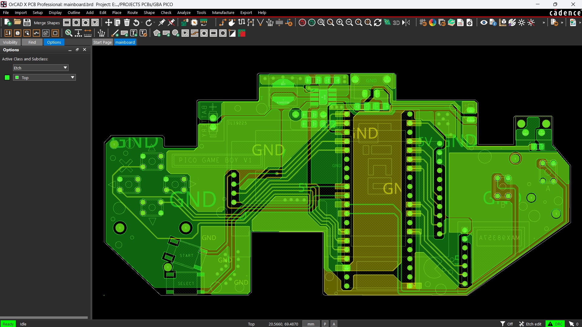 Before starting the PCB Designing process using the Pico-GB wiring scheme, I first made a complete breadboard setup. This included wiring the ILI9225 display to PICO, connecting the MAX Audio Module to PICO, and creating a button board on a perf board with eight buttons, each of which had its GPIO pin connected to PICO.