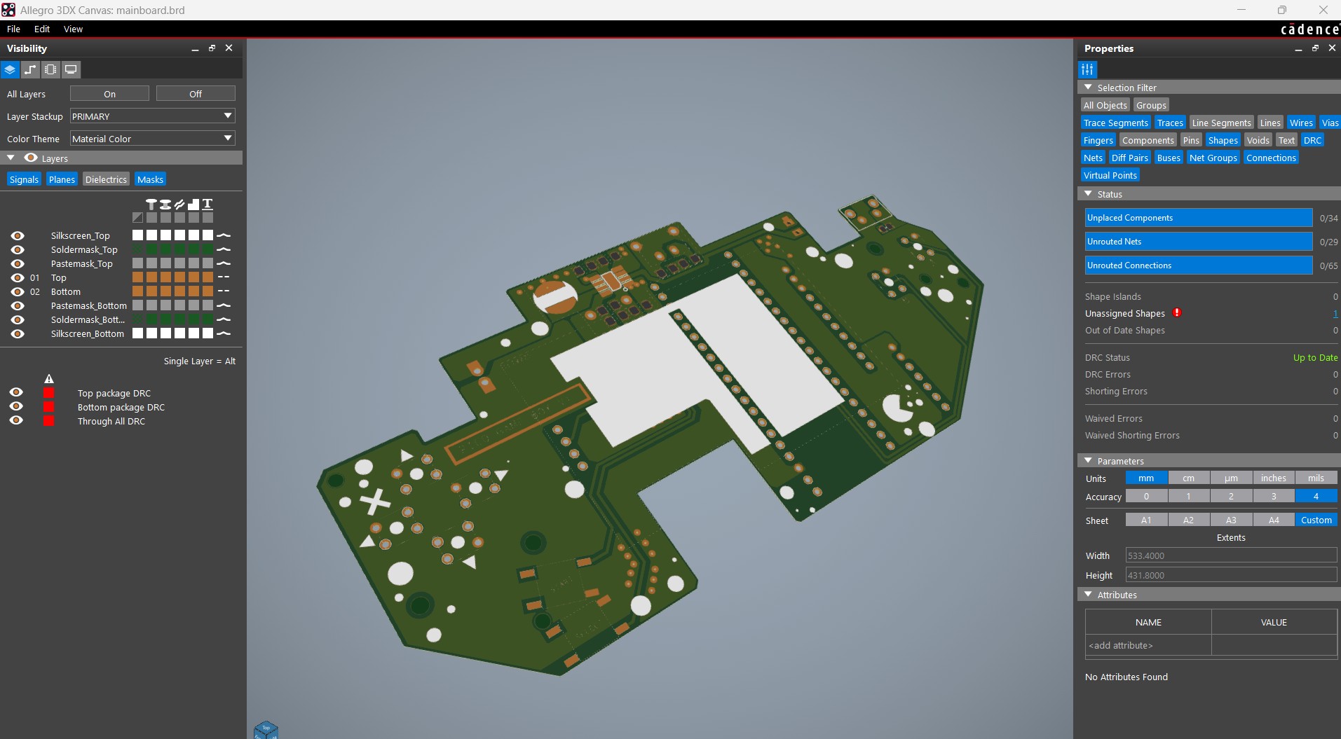 Once the schematic was finalized, we moved on to the PCB layout. The board outline shape was based on the shell dimensions, and component placement was guided by the 3D model.