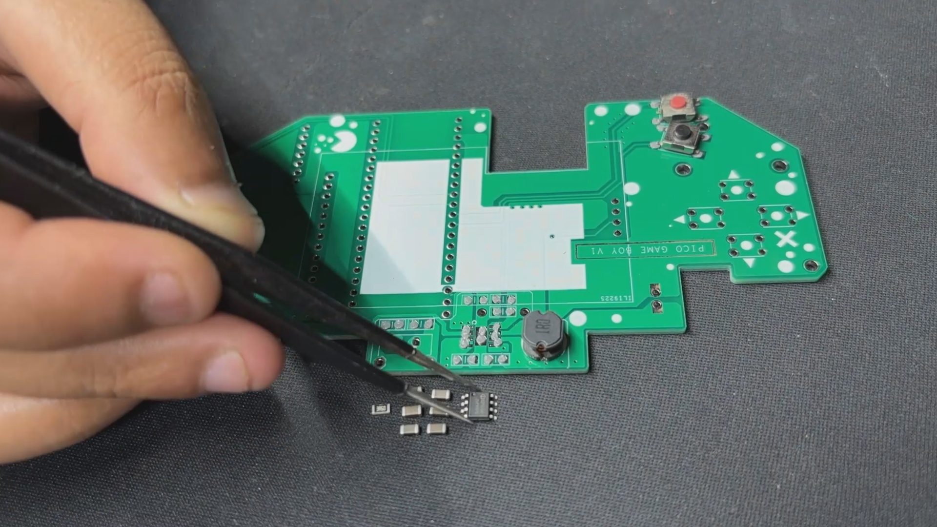 Next, each SMD component is positioned using ESD-safe tweezers, aligning them precisely over their respective pads. Once everything is in place, the board is transferred to a reflow hotplate, which heats the PCB from below until the solder paste melts and secures the components permanently.
