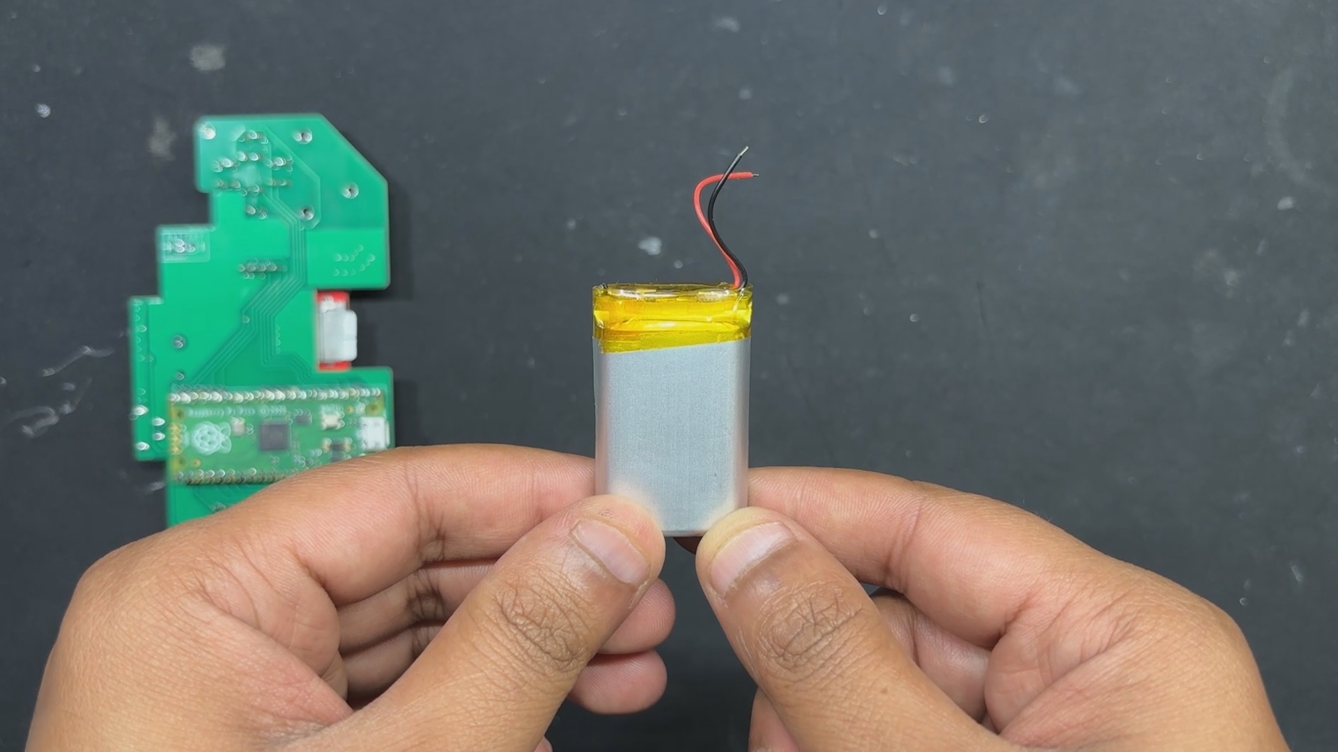 The battery assembly process was straightforward. We soldered the positive terminal of the LiPo to the Battery CON + pad on the PCB, and the negative terminal to the Battery CON – pad. To secure the cell to the back of the board, we used double-sided tape and press-fit it into place—keeping the setup clean, stable, and low-profile.