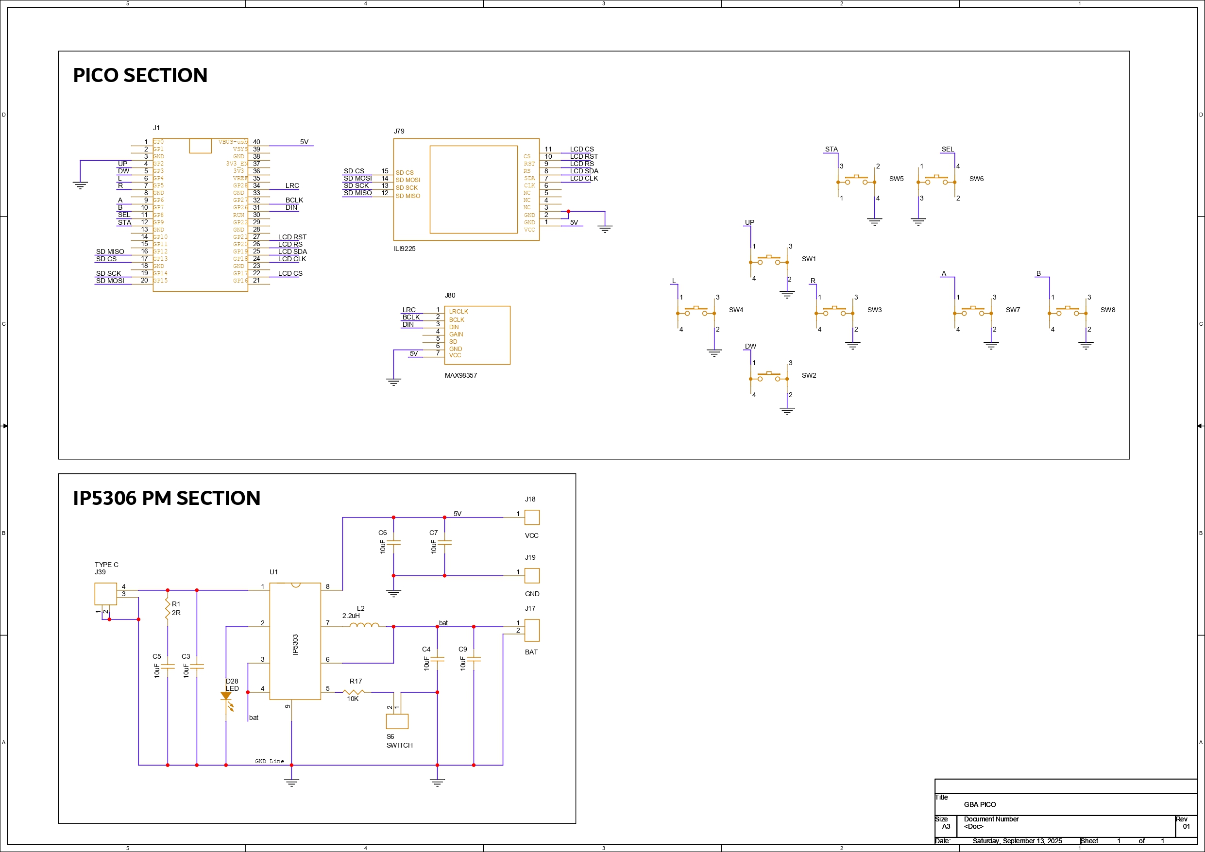 The PCB for PiBoy Advance is split into two major sections: the Pico Setup and the Peripheral Connections. At the heart of it all is the Raspberry Pi Pico, which interfaces with the ILI9225 display, MAX98357 audio module, and a set of push buttons for user input.