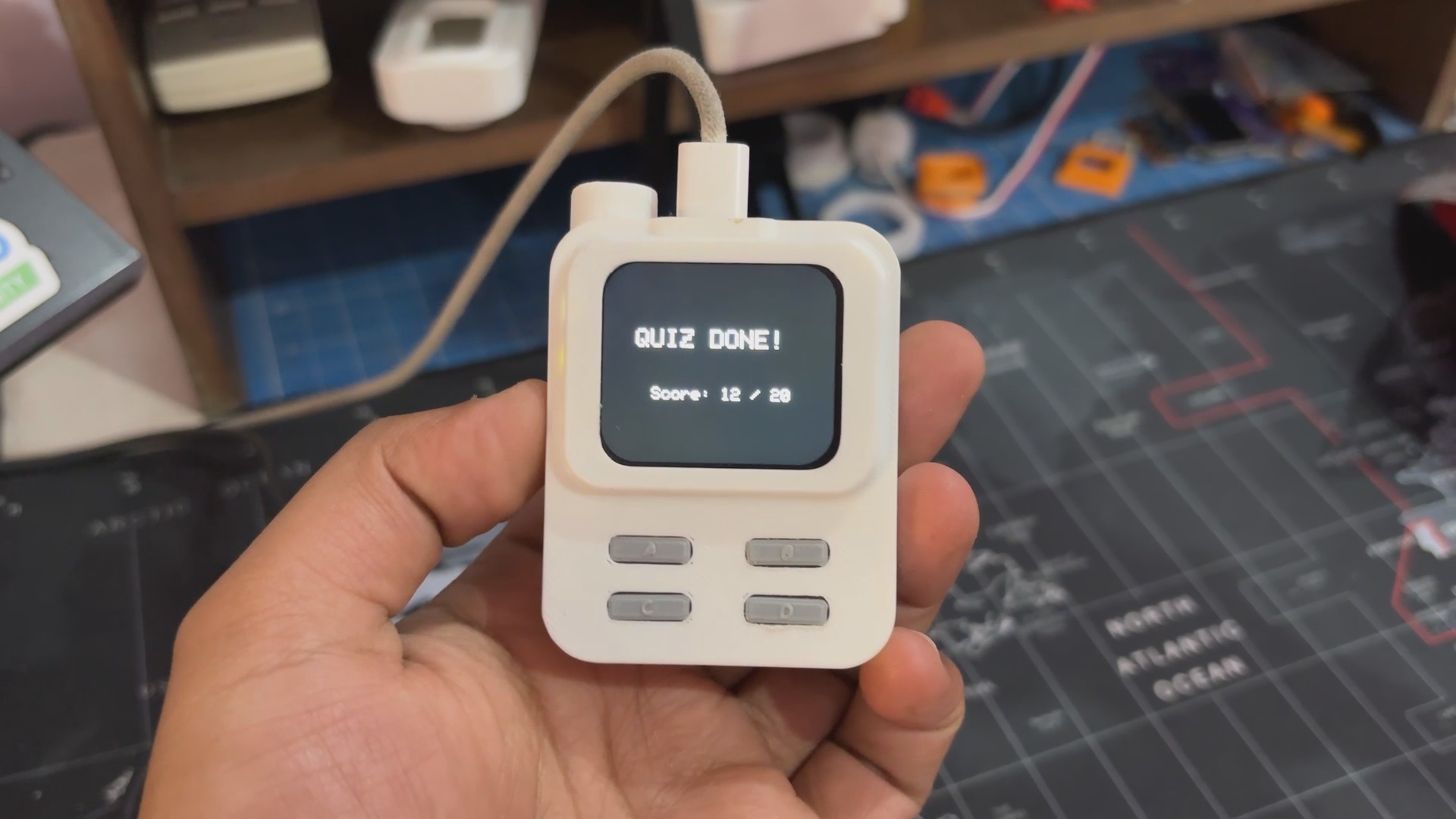 nextQuestion();After an answer is selected, the device shows feedback and moves to the next question. If all 20 questions are done, it shows the final score and resets after 10 seconds.