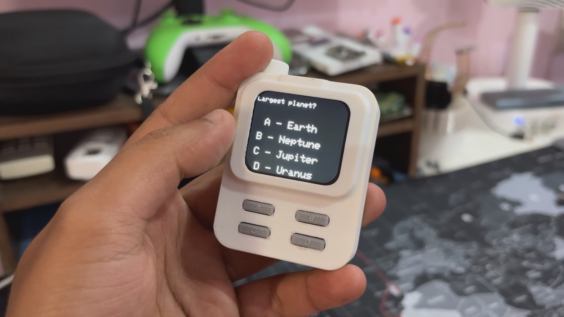 Powered by the ESP32-S3-LCD-1.69, it delivers fast-paced questions with crisp visuals and tactile controls. We modeled and 3D printed a custom enclosure with four tactile buttons, each mapped to an answer choice.