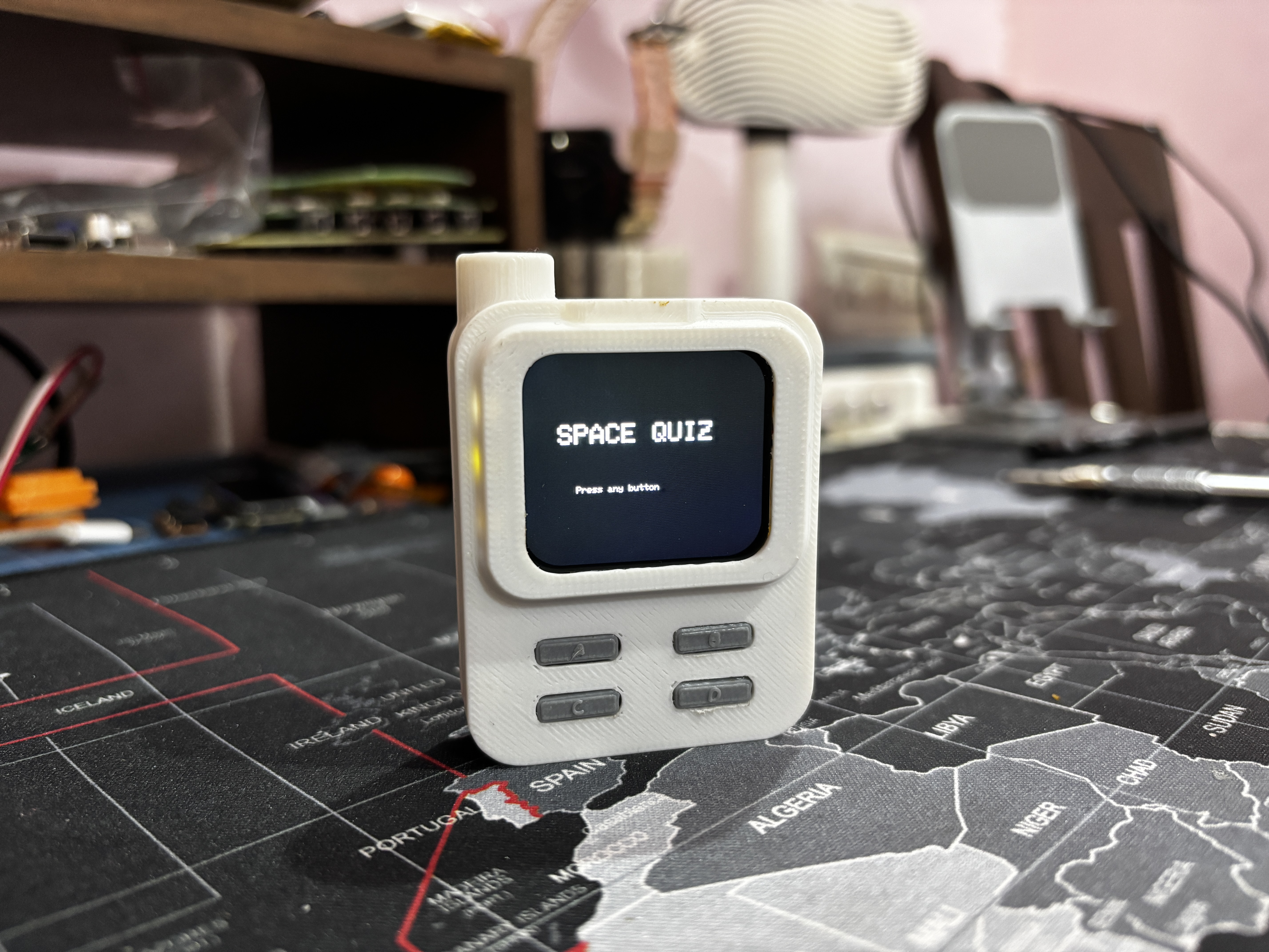 Here's the end result of this small build—QuasarQ, a space quiz device designed to spark curiosity and make learning fun. It’s compact, responsive, and built with care, from the custom 3D-printed enclosure to the tactile button layout and crisp display interface.