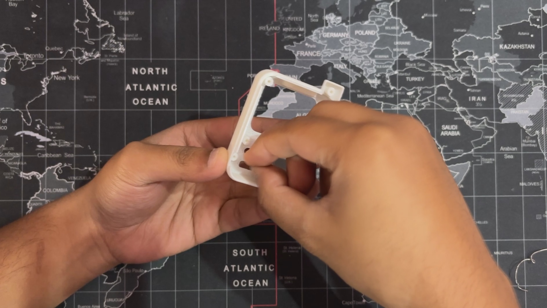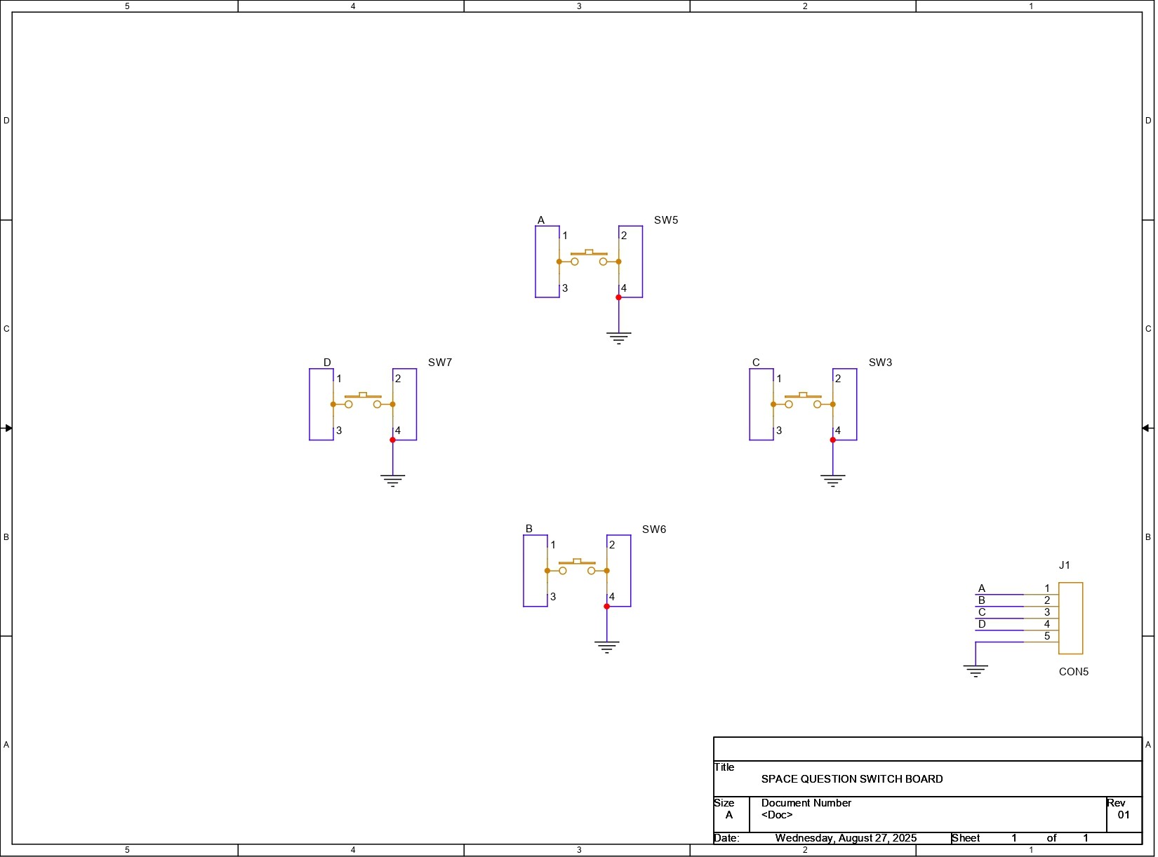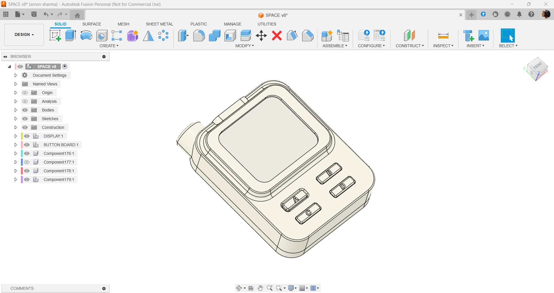 We began the design by importing a model of the ESP32-S3 display board into Fusion360. From there, we created a basic box-style enclosure around the screen. In the lower section, we modeled a switchboardand added four custom switch actuators labeled A, B, C, and D to match the quiz interface. To secure the switch PCB, we included two screw bosses with 1.8 mm diameter holes—ideal for M2 screws.